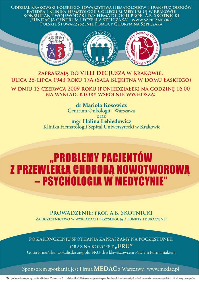 W dniu 15 czerwca 2009 roku w Krakowie odbędzie się wykład pt. „Problemy pacjentów z przewlekłą chorobą nowotworową - psychologia w medycynie”, który wygłoszą dr Mariola Kosowicz z Centrum Onkologii w Warszawie oraz mgr Halina Lebiedowicz z Kliniki Hematologii Szpitala Uniwersyteckiego w Krakowie. Szczegóły w zaproszeniu.