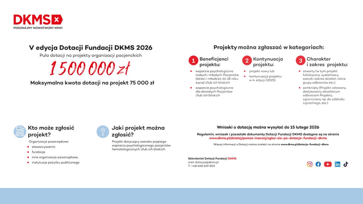 Całkowita pula środków w ramach 5. edycji Dotacji wynosi 1.500.000 złotych. Każdy wnioskodawca może złożyć tylko jeden wniosek i ubiegać się o dotację w maksymalnej wysokości 75.000 złotych na realizację projektu. Środki zostaną przyznane na inicjatywy i projekty obejmujące wsparcie psychologiczne chorych i ich bliskich w procesie leczenia i zdrowienia – zarówno pacjentów przebywających w klinikach transplantacyjnych i na oddziałach hematologicznych w całej Polsce, jak też w domach w trakcie i po zakończeniu leczenia. O Dotację Fundacji DKMS mogą ubiegać się jednostki organizacyjne, takie jak fundacje, stowarzyszenia, instytucje pożytku publicznego oraz inne organizacje pozarządowe. Warunkiem jest, aby organizacja była zarejestrowana i prowadziła działalność na terytorium Polski przez co najmniej 12 miesięcy przed dniem złożenia Wniosku o Dotację, a jednym z przedmiotów ich działalności było wsparcie pacjentów hematoonkologicznych w Polsce. Aplikując należy wypełnić wniosek zgłoszeniowy dostępny na stronie: www.dkms.pl/dotacja-fundacji-dkms a następnie przesłać na adres e-mail wskazany na stronie. Termin przyjmowania wniosków mija 15 lutego 2026 r.