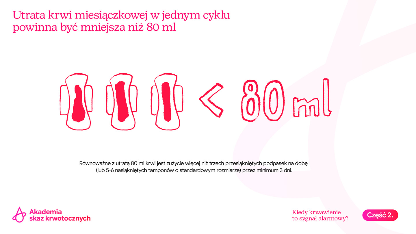 Utrata krwi miesiączkowej w jednym cyklu powinna być mniejsza niż 80 ml. Równoważne z utratą 80 ml krwi jest zużycie więcej niż trzech przesiąkniętych podpasek na dobę (lub 5-6 nasiąkniętych tamponów o standardowym rozmiarze) przez minimum 3 dni.