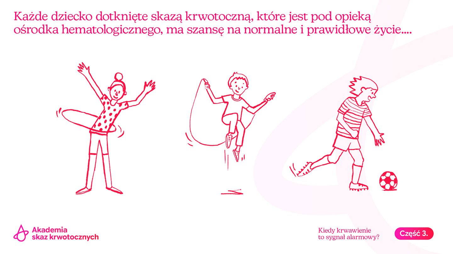 Każde dziecko dotknięte skazą krwotoczną, które jest pod opieką ośrodka hematologicznego, ma szansę na normalne i prawidłowe życie w gronie rówieśników. Prawidłowo prowadzona diagnostyka i leczenie, stosowanie się do zaleceń prowadzącego hematologa pozwalają oswoić się z chorobą, a czasem nawet zupełnie o niej zapomnieć.