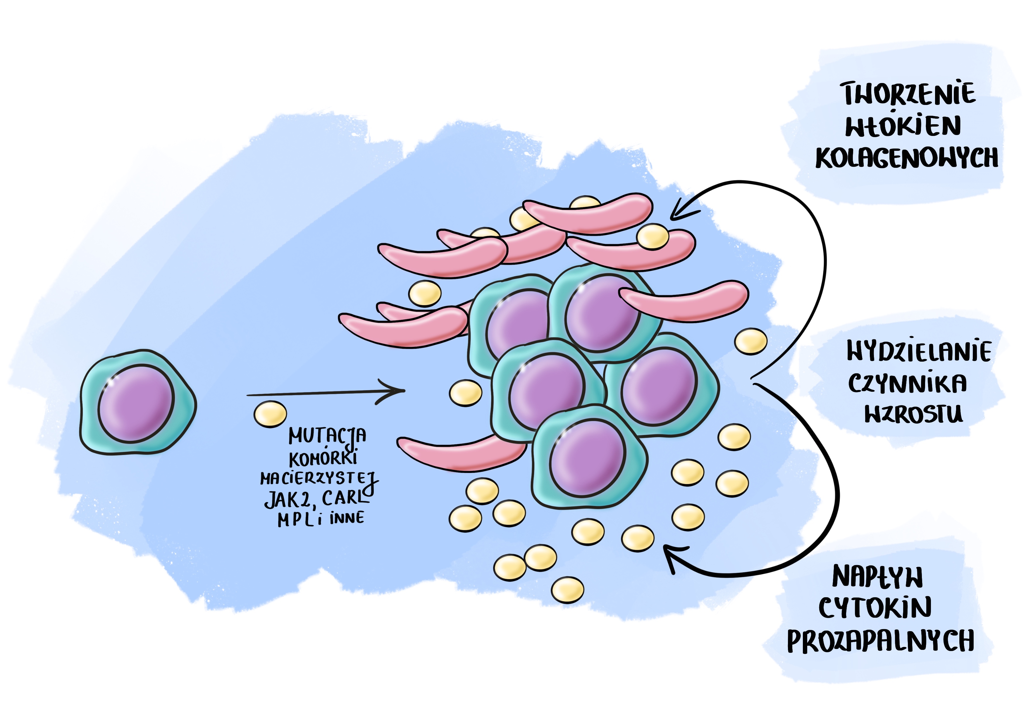 - Włóknienie to proces, w którym szpik kostny zarasta tkanką włóknistą w miejscach, gdzie normalnie powstają krwinki. Mutacje genów JAK2, CALR, MPL oraz inne prowadzą do niekontrolowanego podziału megakariocytów – komórek odpowiedzialnych za produkcję płytek krwi. Megakariocyty stają się „nadaktywne” i wydzielają różne czynniki wzrostu i cytokiny, które powodują wytwarzanie włókien kolagenowych w szpiku kostnym. W wyniku tego normalna tkanka szpiku jest zastępowana przez struktury włókniste, co uniemożliwia prawidłową produkcję krwinek czerwonych.
