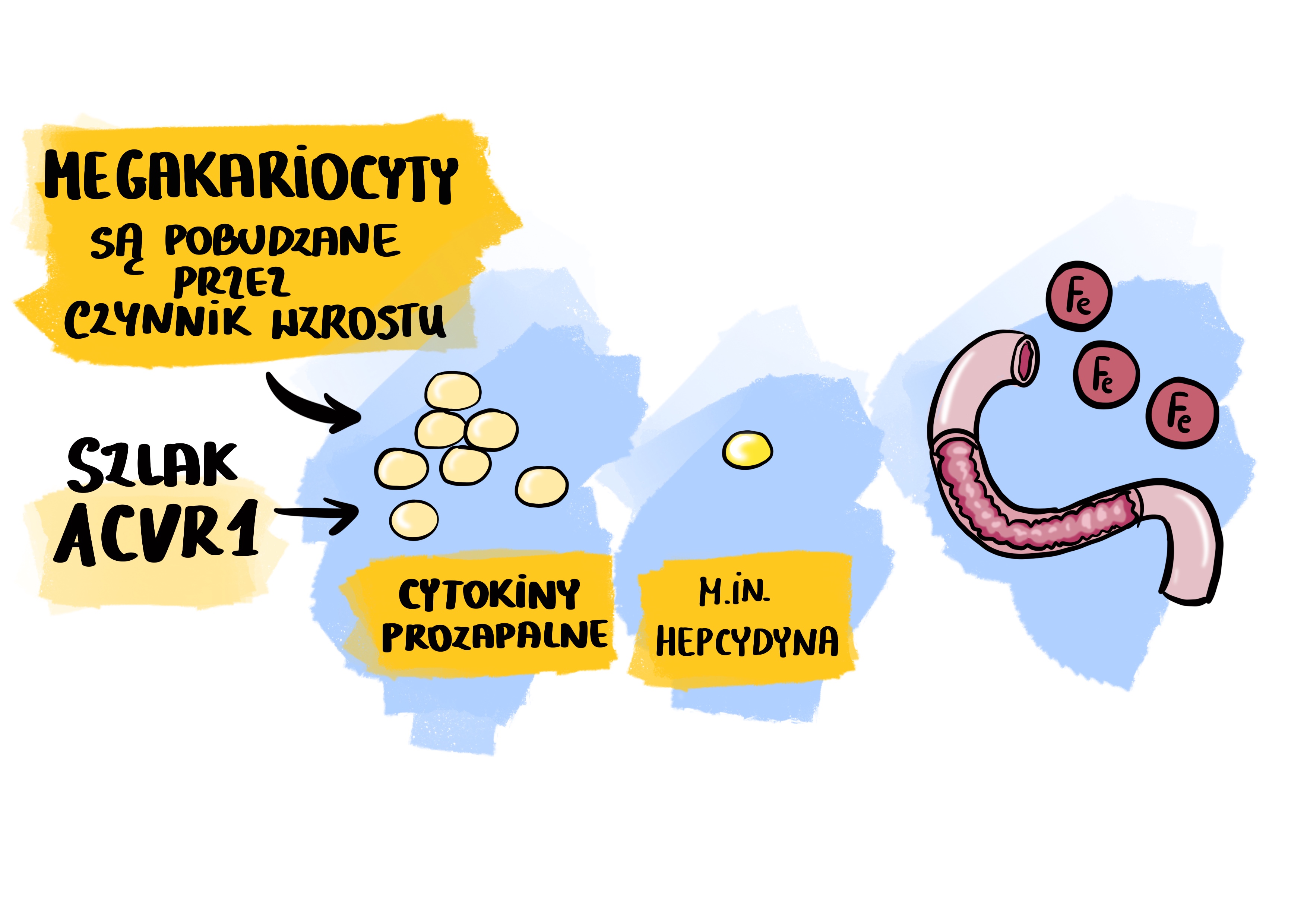 - Przewlekły stan zapalny. W patogenezie anemii nie można zapomnieć o roli stanu zapalnego. W mielofibrozie dochodzi do nadmiernej produkcji cytokin, czyli białek zapalnych. Jedną z takich cytokin jest hepcydyna, odpowiedzialna za regulację gospodarki żelaza. Pod wpływem aktywacji szlaku ACVR1 dochodzi do zahamowania uwalniania żelaza z magazynów organizmu oraz ograniczenia jego wchłaniania z przewodu pokarmowego. Poziom żelaza we krwi się zmniejsza. Niedobór dostępnego żelaza dodatkowo utrudnia produkcję czerwonych krwinek i powoduje anemię.