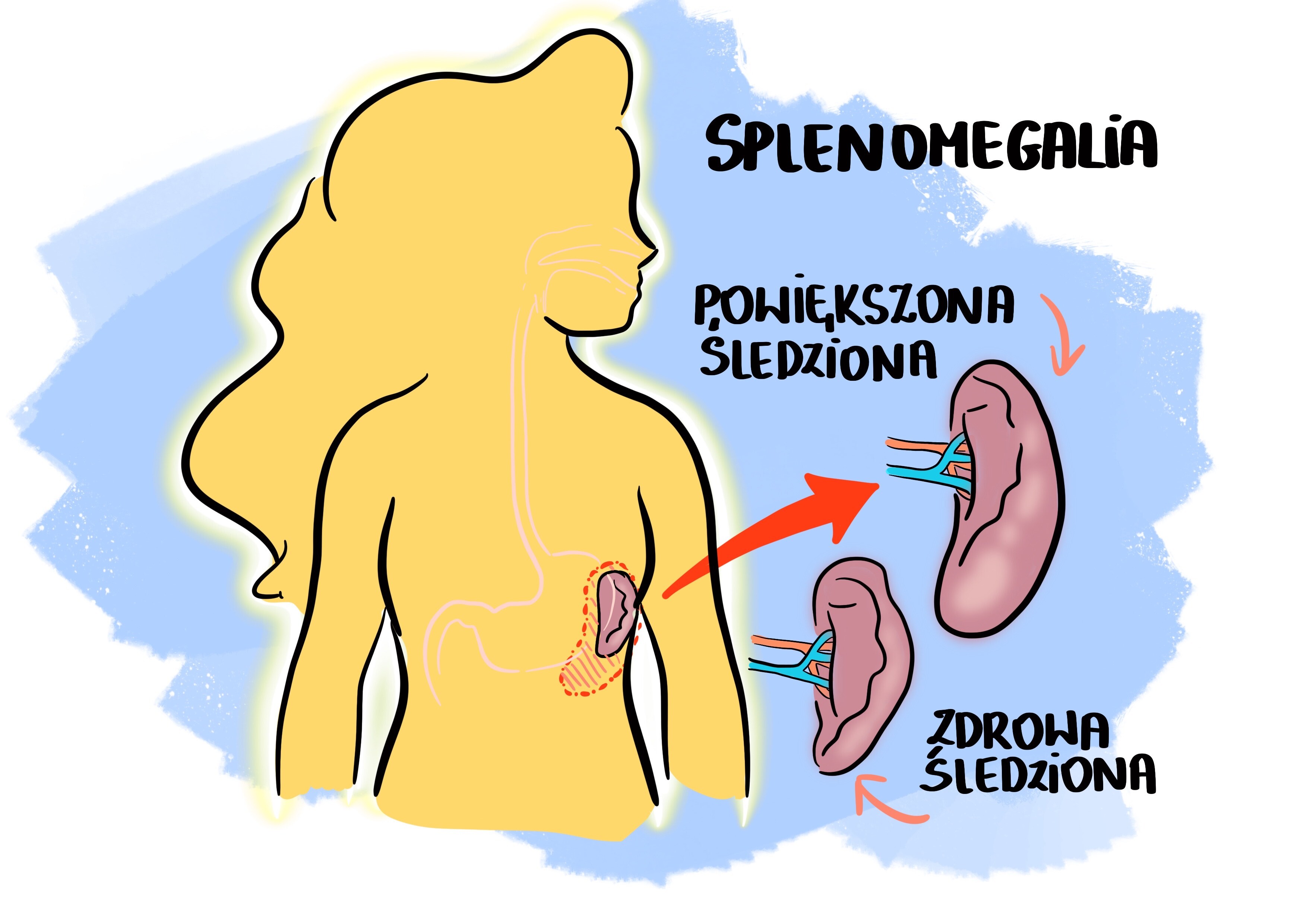 - Splenomegalię (powiększenie wielkości śledziony) z towarzyszącym hipersplenizmem, czyli „zwiększoną aktywnością” śledziony polegającą na nadmiernym niszczeniu i usuwaniu krwinek przez makrofagi śledzionowe.