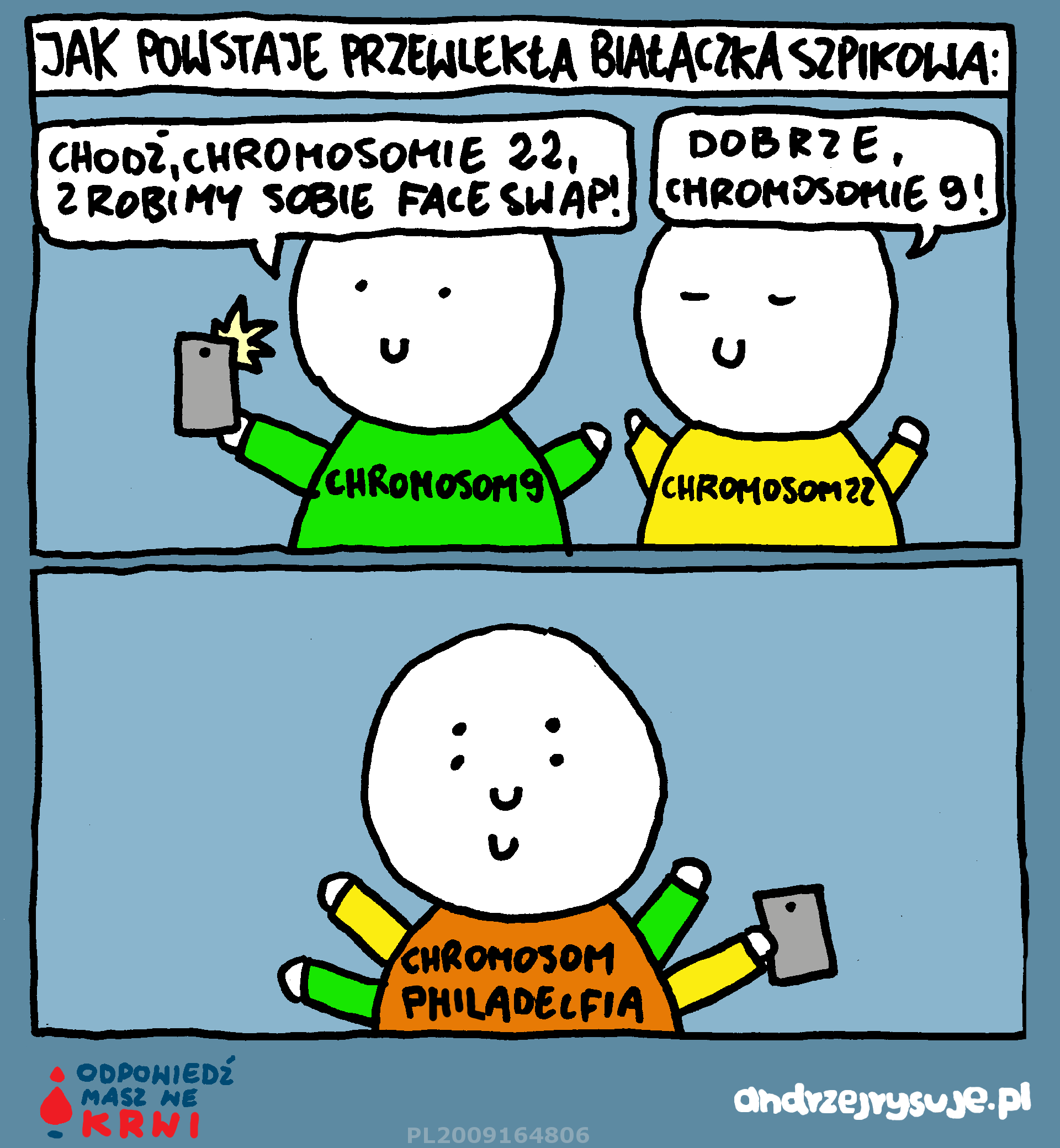 Zwiększona liczba białych krwinek (leukocytoza) w badaniu morfologicznym pozwala na rozpoczęcie dalszej diagnostyki. Niemal u każdego pacjenta (u 95%) z PBSz występuje tzw. chromosom Philadelphia (PH+). Powstaje on na skutek wymiany fragmentów chromosomów 9 i 22, które oddzielają się i zamieniają miejscami. Dlatego każdego roku 22. września obchodzony jest Międzynarodowy Dzień Świadomości Przewlekłej Białaczki Szpikowej.
