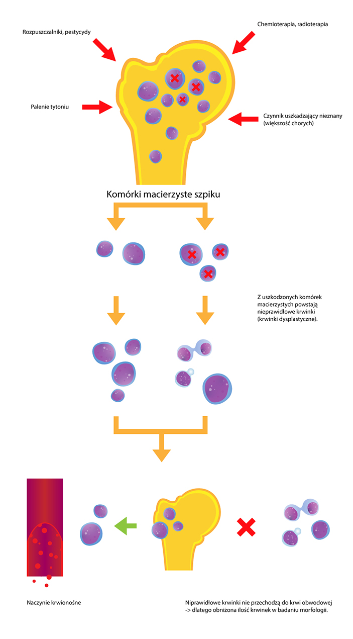 Uważa się, że przyczyną nowotworu mielodysplastycznego jest nieodwracalne uszkodzenie tej „wyjściowej”, pierwotnej komórki szpiku, czyli komórki macierzystej. Pomimo tego uszkodzenia, krwinki w dalszym ciągu powstają i dojrzewają w szpiku, jednak są one nieprawidłowe. W badaniu pod mikroskopem różnią się wyglądem od prawidłowych krwinek (np. są większe, mają inny kształt, itp.) - o takich krwinkach mówimy, że są dysplastyczne i stąd nazwa choroby. Te nieprawidłowe krwinki nie przechodzą do krwi obwodowej i dlatego stwierdzamy ich zmniejszoną ilość w badaniu morfologii krwi. Podsumowując, w nowotworze mielodysplastycznym szpik wytwarza dużą ilość krwinek, jednak są one nieprawidłowe i dlatego brakuje ich we krwi obwodowej. Z tego powodu objawy choroby związane są z niedoborem poszczególnego rodzaju krwinek (szczegółowo opisane w zakładce Przebieg choroby). W części przypadków zaburzenie w wytwarzaniu i dojrzewaniu krwinek są tak duże, że w szpiku coraz większy odsetek zaczynają stanowić bardzo młode komórki określane jako blasty. Postacie choroby z nadmierną ilością blastów (czyli jeśli stanowią one pomiędzy 5 a 19% wszystkich komórek w szpiku) mają bardziej agresywny przebieg i bardzo często przechodzą w ostrą białaczkę szpikową.