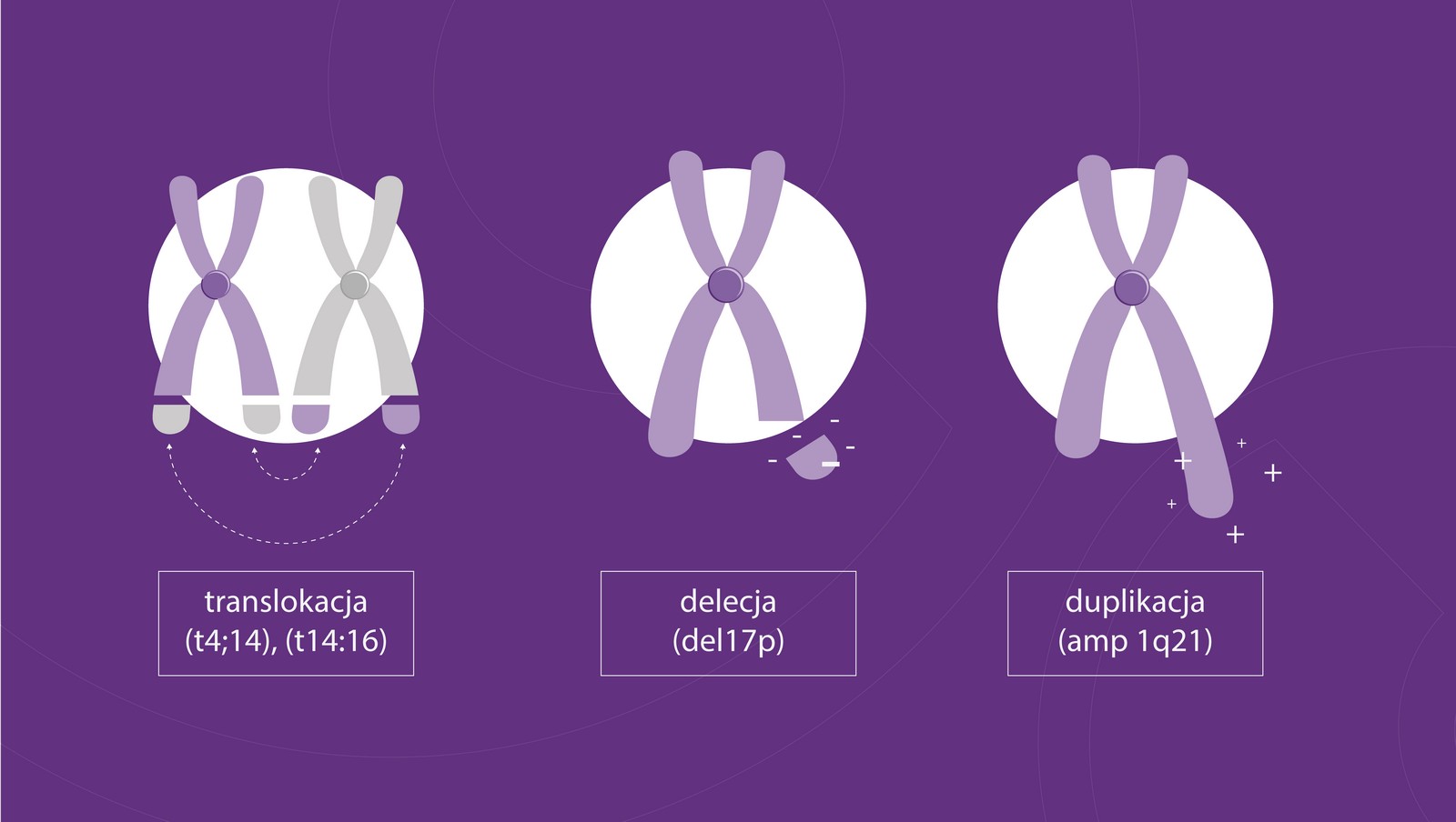 Typowymi przykładami zmian w przypadku MM są translokacja 4:14 (t4;14), translokacja 14:16 (t14:16), delecja w chromosomie 17 (del(17p).