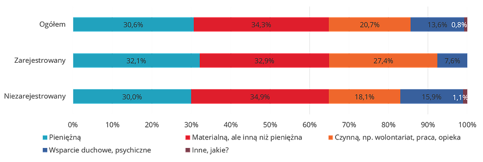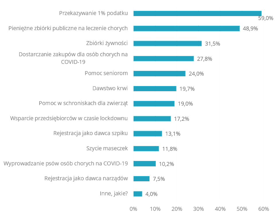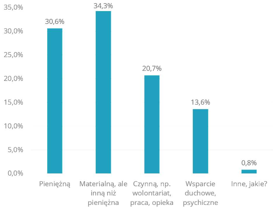 - Blisko 21 proc. respondentów preferuje czynną formę pomocy, np. wolontariat.