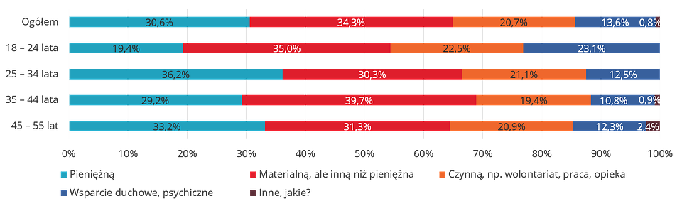 Warto podkreślić, że badani z najmłodszej grupy wiekowej (18-24 lata) znacząco rzadziej niż respondenci z pozostałych grup wskazywali, iż preferowaną przez nich formą pomagania innym jest wsparcie pieniężne (19 proc.), ale za to częściej niż pozostali deklarowali wsparcie duchowe (23 proc.). Co warto podkreślić, również ta grupa respondentów najchętniej angażuje się w czynną formę pomocy, jaką są wolontariat, opieka, praca (23 proc.). Z kolei badani w wieku od 35 do 44 lat częściej od pozostałych wskazywali, że wybieraną przez nich formą udzielania pomocy jest wsparcie materialne, ale odmienne od pieniężnego (40 proc.). Na wsparcie finansowe najchętniej wskazywali respondenci z grupy wiekowej 25-34 lata (36 proc.).