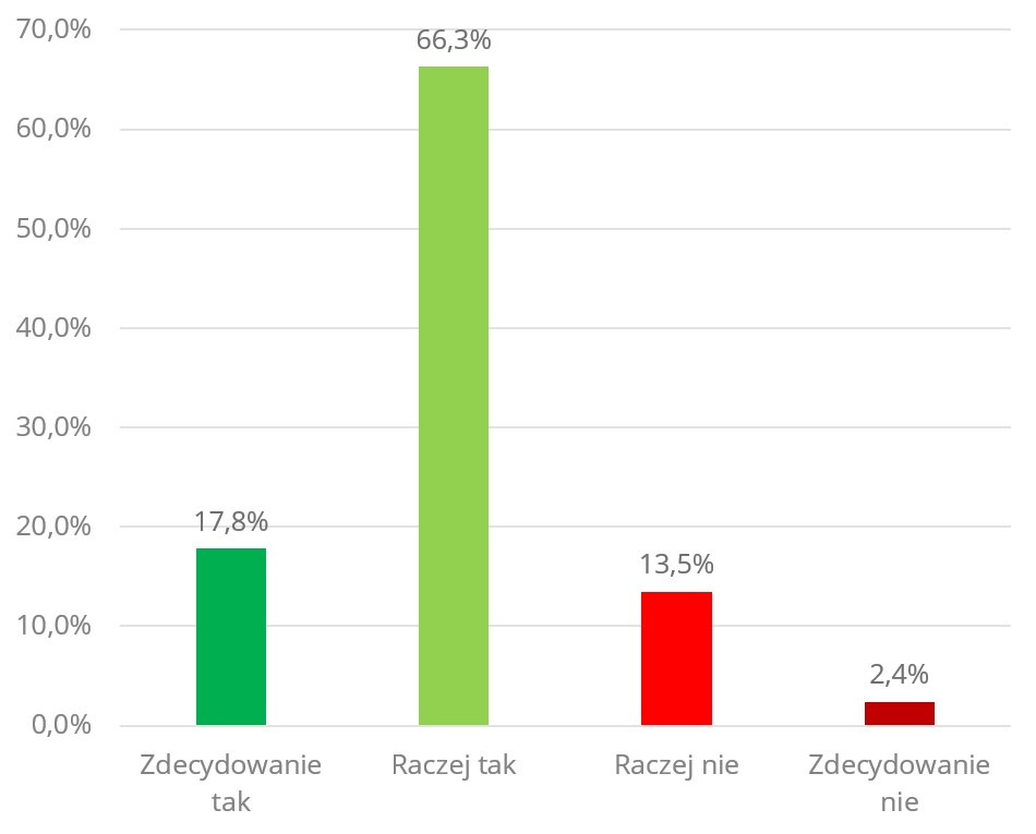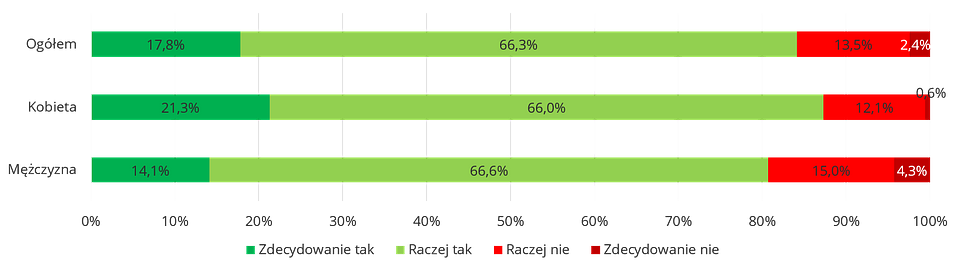 Uczestnicy badania zostali poproszeni o odpowiedź na pytanie, czy udzielają szeroko rozumianej pomocy osobom potrzebującym. Aż 84 proc. ankietowanych zadeklarowało, że pomaga innym, z czego odpowiedzi „zdecydowanie tak” udzieliło blisko 18 proc. badanych, a nieco ponad 66 proc. - „raczej tak”. Pomocy „raczej nie udziela” 14 proc. badanych, a 2 proc. ankietowanych w ogóle nie angażuje się w takie działania. Co ciekawe, wyniki pokazują, że kobiety częściej niż mężczyźni deklarują udzielanie pomocy innym („zdecydowanie tak”) – odpowiednio: 21 proc. do 14 proc.