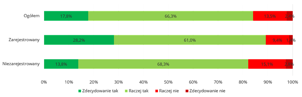 Udzielanie pomocy - respondenci zarejestrowani jako potencjalni Dawcy szpiku częściej niż respondenci niezarejestrowani wskazywali, że zdecydowanie udzielają pomocy osobom potrzebującym.