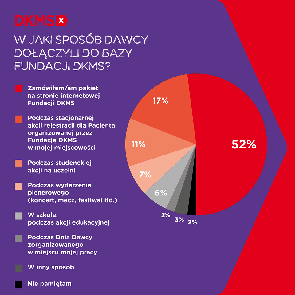 Najczęstszym sposobem rejestracji w bazie potencjalnych Dawców szpiku Fundacji DKMS było zamówienie pakietu na stronie internetowej – 52 proc. Na drugim miejscu znalazły się akcje i wydarzenia organizowane przez Fundację DKMS: akcje rejestracji dla Pacjenta, studenckie akcje, wydarzenia plenerowe, akcje edukacyjne w szkołach, Dzień Dawcy w pracy - łącznie 43 proc. wskazań.
