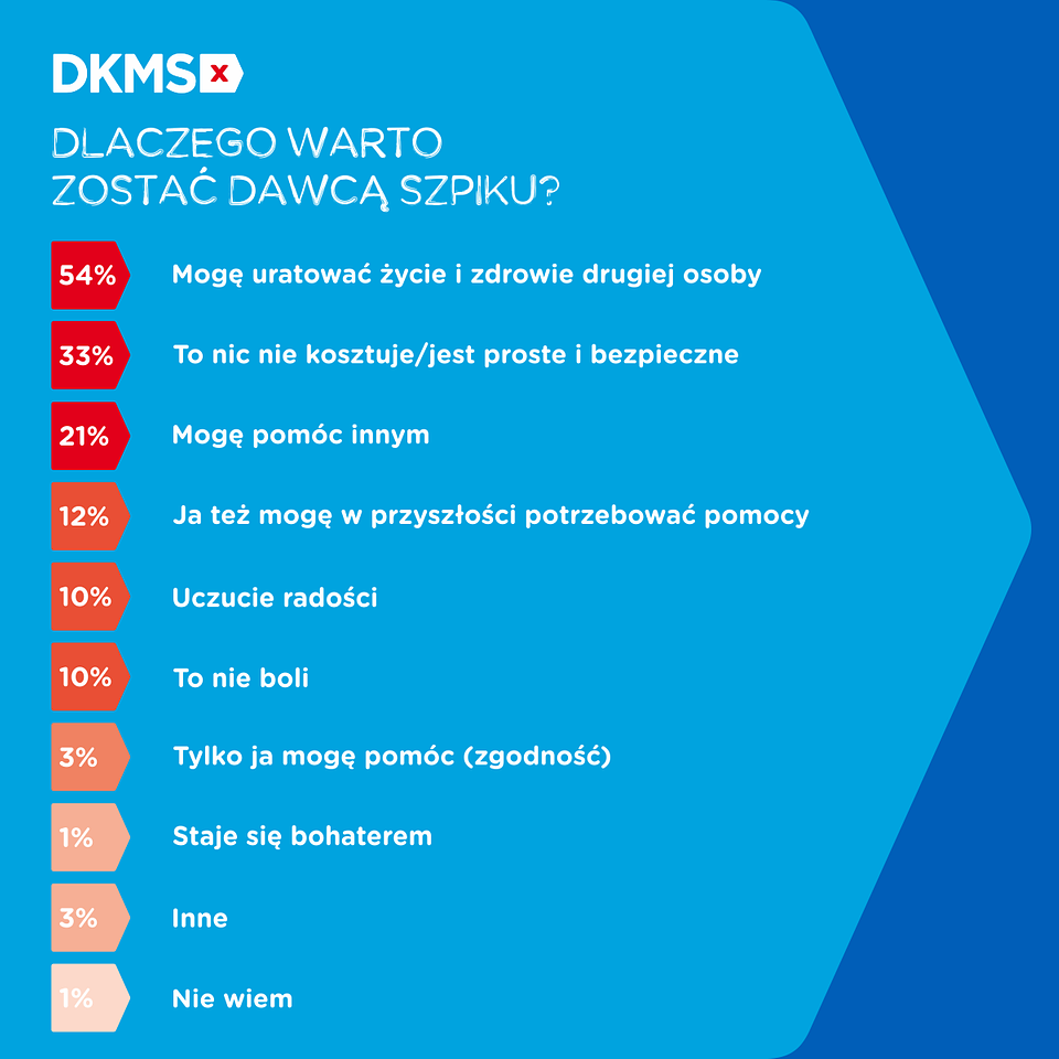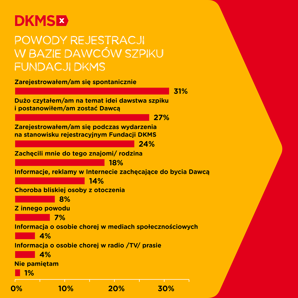 Żeby zostać potencjalnym Dawcą szpiku, należy wykonać jeden prosty krok – zarejestrować się! Faktyczni Dawcy szpiku, zapytani o powody dołączenia do bazy Fundacji DKMS najczęściej odpowiadali, że zarejestrowali się spontanicznie – 31 proc. 27 proc. respondentów przyznało, że dużo czytało na temat idei dawstwa i to skłoniło ich do rejestracji. Na trzecim miejscu znalazła się spontaniczna rejestracja na stoisku Fundacji DKMS podczas jakiegoś wydarzenia – 24 proc. Prawie co piątego Dawcę do rejestracji zachęcili znajomi lub rodzina – 18 proc. Dla 4 proc. respondentów impulsem była informacja o osobie chorej w mediach społecznościowych. W przypadku tej grupy Facebook był najczęstszym źródłem informacji – 76 proc.