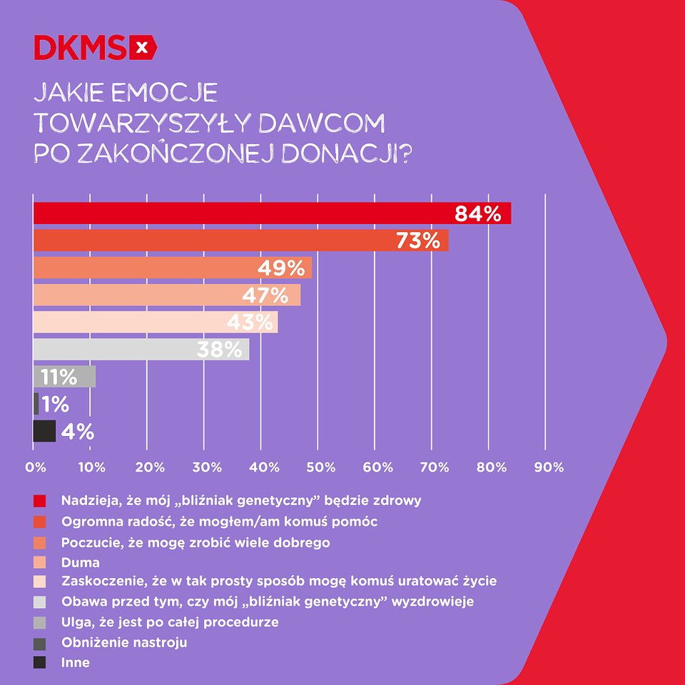 Dawcy zapytani o emocje, jakie towarzyszyły im po zakończonej donacji, wskazywali najczęściej nadzieję na to, że ich „bliźniak genetyczny” wyzdrowieje - 84 proc. oraz radość wynikającą z pomocy osobie potrzebującej – 73 proc. Prawie połowa Dawców faktycznych miała poczucie, że może zrobić wiele dobrego (49 proc.), a 47 proc. odczuwało dumę. 43 proc. badanym było zaskoczonych, że w tak prosty sposób może uratować komuś życie.