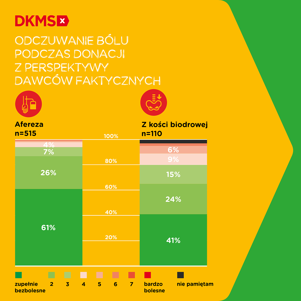 U zdecydowanej większości Dawców faktycznych pobranie krwiotwórczych komórek macierzystych odbyło się za pomocą aferezy – 82 proc., 17 proc. oddało szpik metodą z talerzy kości biodrowej, a 1 proc. (8 osób) miało wielokrotną donację za pomocą wymienionych metod. Obie metody są uważane za bezbolesne lub mało bolesne. W przypadku aferezy zupełną bezbolesność wskazało aż 61 proc. Dawców, a przy pobraniu z talerza kości biodrowej – 41 proc.