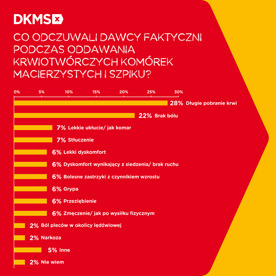Na pytanie o samopoczucie lub ewentualne dolegliwości bólowe podczas donacji, większość Dawców faktycznych wymieniała lekkie dolegliwości/dyskomfort, a 22 proc. badanych zadeklarowało, że nie odczuwało żadnego bólu. Samopoczucie podczas oddawania komórek macierzystych bądź szpiku porównywane było najczęściej z długim pobraniem krwi – 28 proc., a co się z tym wiąże lekkim ukłuciem na początku – 7 proc., dyskomfortem związanym z długim, kilkugodzinnym siedzeniem w jednej pozycji – 6 proc. Część Dawców odczuwało ból jak po stłuczeniu - 7 proc., dolegliwości grypopodobne, przeziębieniowe lub jak po wysiłku fizycznym - po 6 proc. Dla 6 proc. Dawców zastrzyki z czynnikiem wzrostu okazały się bolesne.