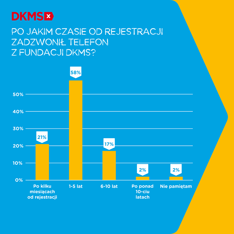 Gdy potencjalny Dawca szpiku otrzymuje telefon z Fundacji DKMS, to znaczy, że jego „bliźniak genetyczny” potrzebuje pomocy. Faktyczni Dawcy szpiku, którzy wzięli udział w badaniu, otrzymali informację o tym, że mogą pomóc Pacjentowi, najczęściej od roku do pięciu lat od rejestracji – 58 proc. Wśród badanych znalazły się osoby, do których Fundacja DKMS zadzwoniła już po kilku miesiącach od rejestracji – 21 proc. Jakie uczucia towarzyszyły Dawcom podczas rozmowy?