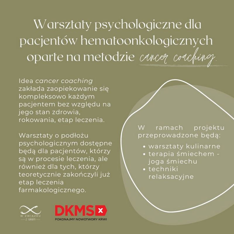 28.11.2022 r. we Wrocławiu przy ulicy Legnickiej 65 (budynek Sektor 3) odbędą się kolejne warsztaty psychologiczne dla pacjentów hematoonkologicznych. Zapraszamy serdecznie pacjentów i ich najbliższych do wzięcia udziału w projekcie. Idea cancer coaching zakłada zaopiekowanie się kompleksowo każdym pacjentem bez względu na jego stan zdrowia, rokowania, etap leczenia. Warsztaty o podłożu psychologicznym dostępne będą dla pacjentów, którzy są w procesie leczenia, ale również dla tych, którzy teoretycznie zakończyli już etap leczenia farmakologicznego.