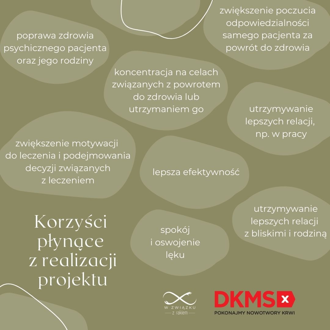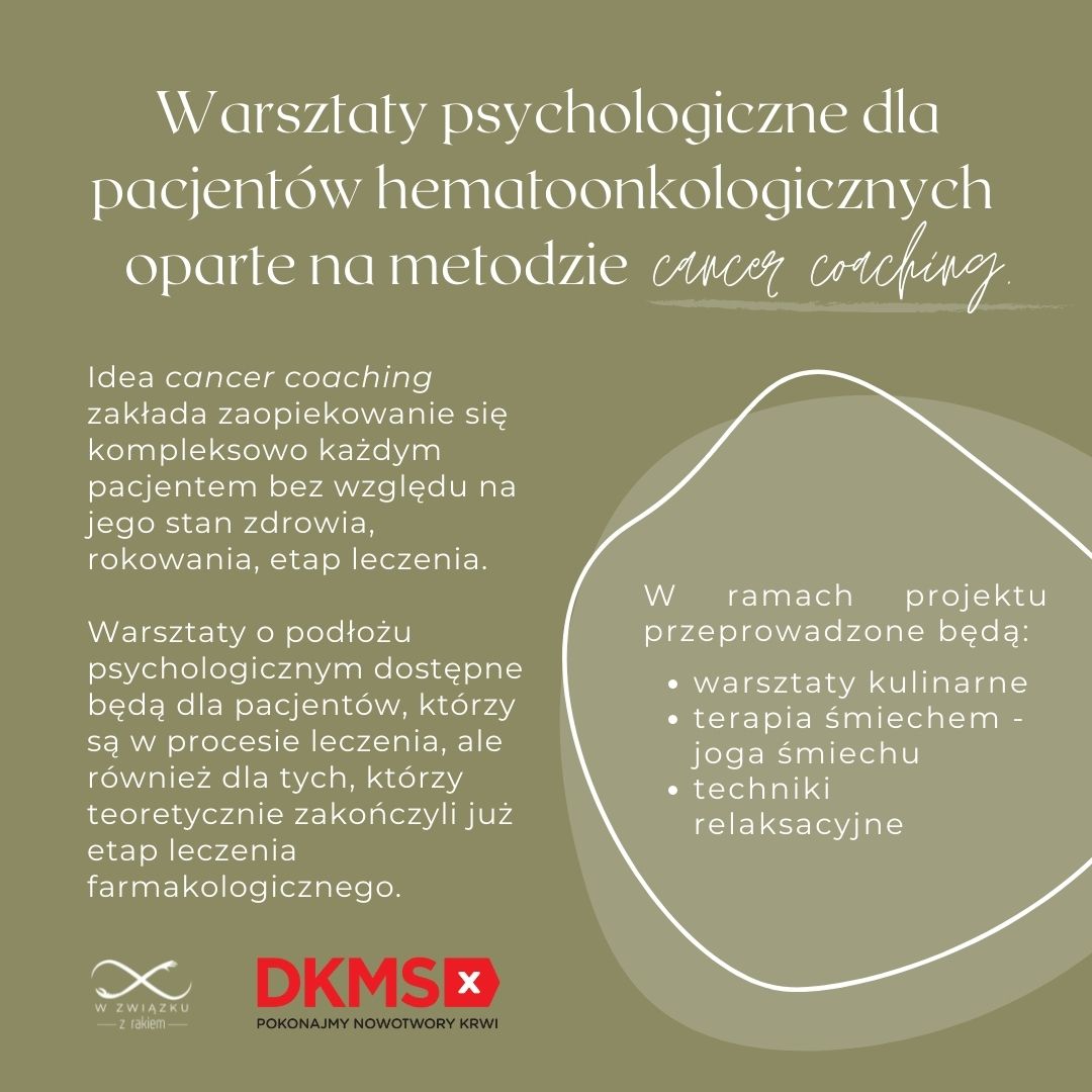 Projekt kierujemy do pacjentów hematoonkologicznych, u których zdiagnozowano chorobę, co istotne na każdym etapie leczenia. Idea cancer coaching zakłada zaopiekowanie się kompleksowo każdym pacjentem bez względu na jego stan zdrowia, rokowania, etap leczenia. Warsztaty o podłożu psychologicznym dostępne będą dla pacjentów, którzy są w procesie leczenia, ale również dla tych, którzy teoretycznie już zakończyli etap leczenia farmakologicznego. Chcemy objąć warsztatami cancer coaching wszystkich chorujących na nowotwory krwi bez względu na wiek (dorośli, młodzież, dzieci). Metoda pracy z pacjentami jest wszechstronna i doskonale znana w krajach Europy Zachodniej oraz w Stanach Zjednoczonych. W Polsce jest to nowość. Odbiorcami pośrednimi będą rodziny osób chorujących na nowotwory krwi. Będą oni mogli brać udział w niektórych zajęciach skonstruowanych w tak sposób, aby nieść wsparcie psychologiczne zarówno dla pacjenta, jak i jego bliskich. W myśl zasady, że kiedy w rodzinie choruje jedna osoba, cierpią wszyscy. Realizacja projektu gwarantuje dostęp do następujących warsztatów i zajęć: