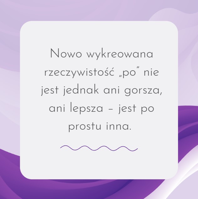 Zakończenie leczenia często zmusza do przemyślenia dotychczasowych priorytetów i tego, co naprawdę ważne. Wiele osób traktuje chorobę jako podróż, która, pomimo bólu i cierpienia, otwiera nowe okna na nowy świat. A nowe zmiany, rytuały i początki mogą przynieść radość, ulgę i równowagę nie tylko emocjonalną, ale także okazać się nieodzownym elementem w procesie zdrowienia i powrotu do pełni sił dla Ciebie i Twoich bliskich.