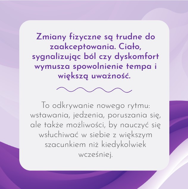 Teraz trzeba się nauczyć siebie na nowo – zarówno swoich ograniczeń, jak i nowej siły. Trzeba zaakceptować zmienione ciało, priorytety, poglądy. Trzeba zaakceptować życie, które wygląda zupełnie inaczej niż wyglądało kiedyś, ale przede wszystkim – trzeba dać sobie na to wszystko czas.
