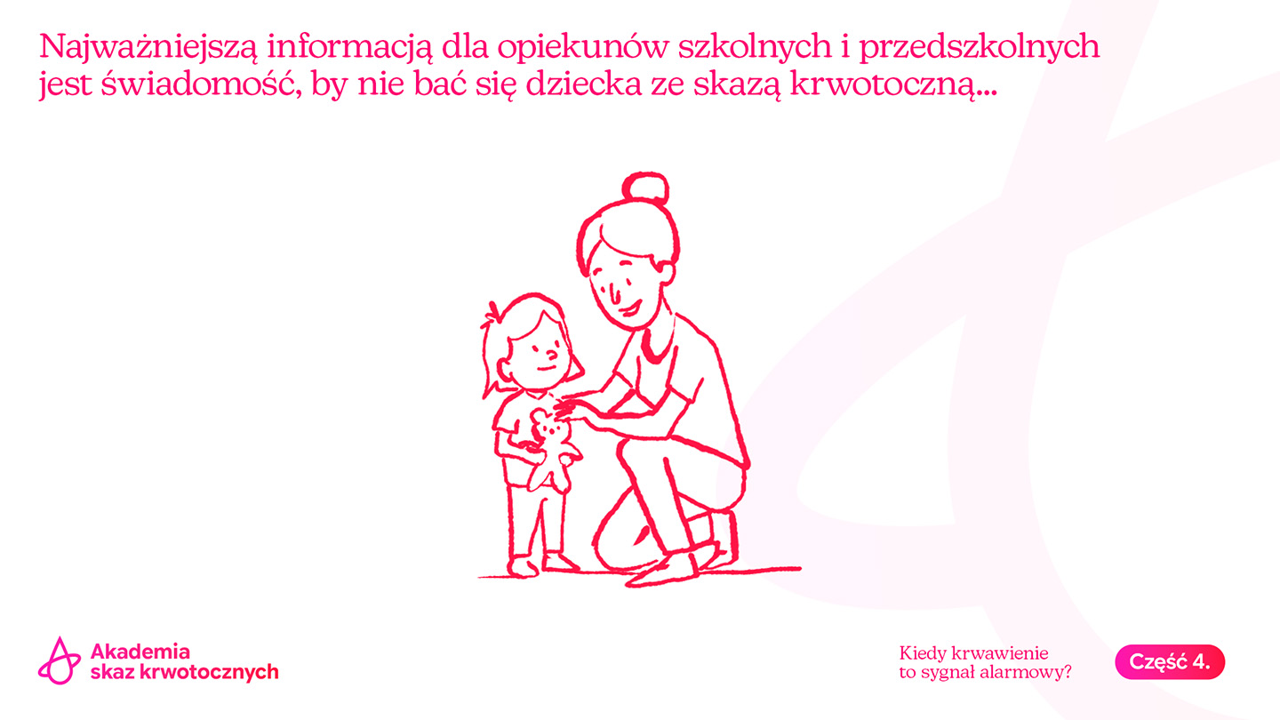 Najważniejszą informacją, którą należy przekazać opiekunom szkolnym lub przedszkolnym jest świadomość, aby NIE BAĆ się dziecka ze skazą krwotoczną. A osoby ze skazą krwotoczną nie powinny bać się prosić o pomoc.